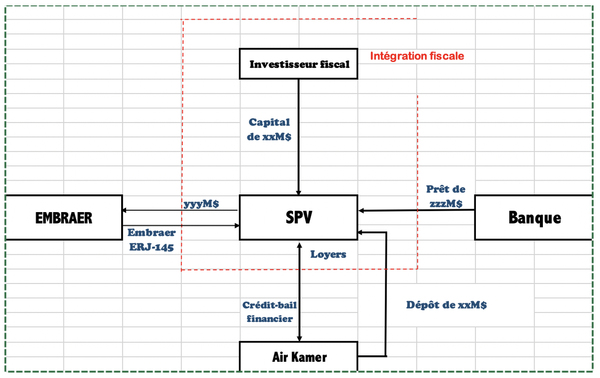 Fig. : schéma du financement de 5 Embraer ERJ-145 pour Air Kamer avec un investisseur fiscal