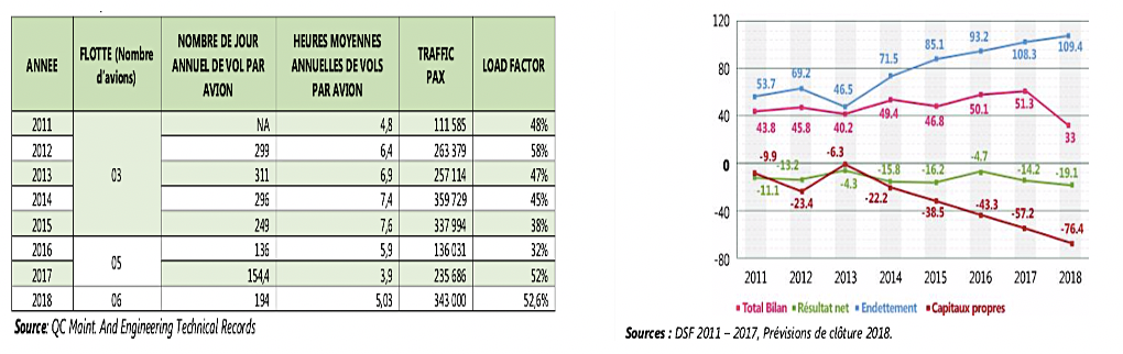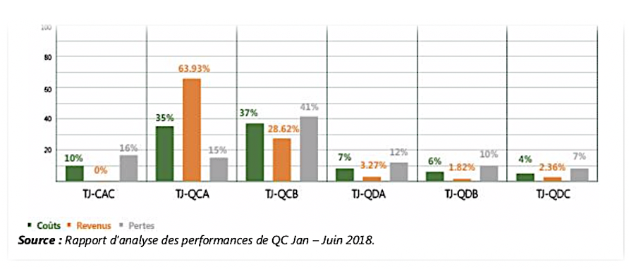 Pour illustrer ce qui précède, nous allons examiner un extrait du rapport d’analyse des performances de QC de Janvier à Juin 2018 de la compagnie aérienne Camerounaise dénommée Camair-Co, notamment le graphe de rentabilité des avions et le tableau d’analyse du seuil de rentabilité́ des lignes domestiques, régionales et internationales pour constater que le modèle d’exploitation de cette compagnie reste structurellement déficitaire.